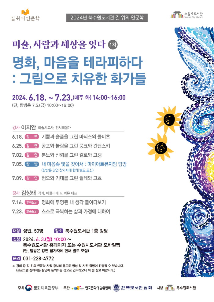 ‘명화, 마음을 테라피하다: 그림으로 치유한 화가들’은 북수원도서관의 2024년 길 위의 인문학 사업 프로그램인 ‘미술, 사람과 세상을 잇다’의 첫 번째 주제다.