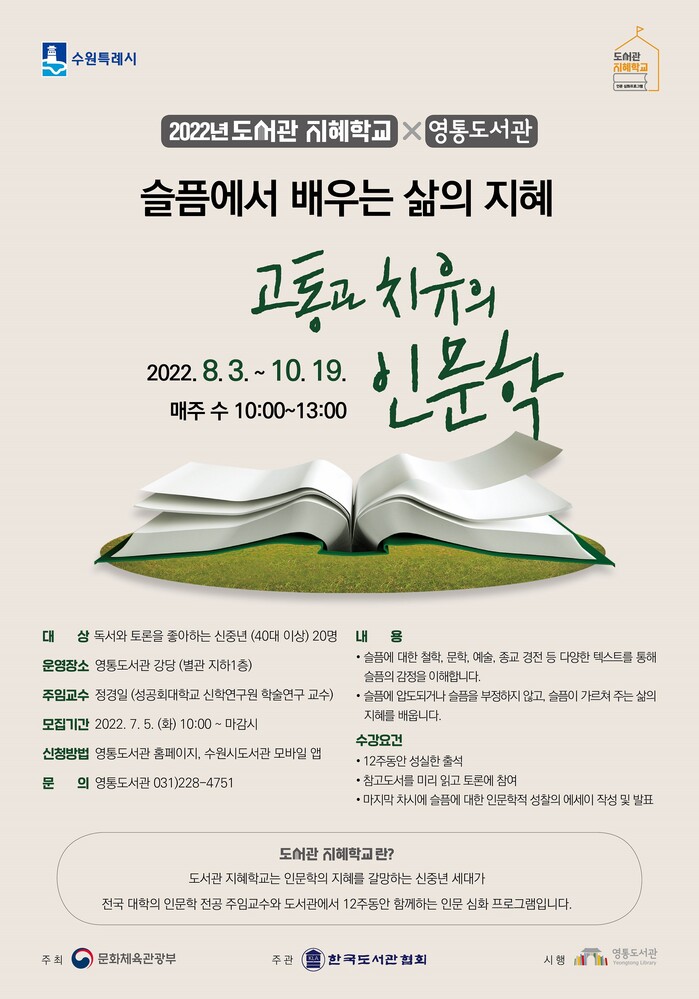 수원시 영통도서관은 2022년 도서관 지혜학교 ‘슬픔에서 배우는 삶의 지혜: 고통과 치유의 인문학’ 수강생 20명을 5일 오전 10시부터 선착순으로 모집한다.