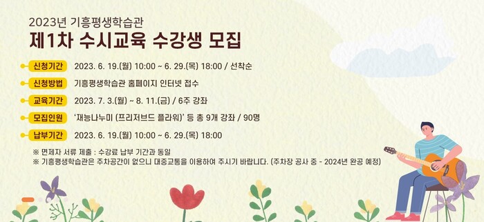 접수 방법은 기흥평생학습관 홈페이지(https://lll.yongin.go.kr/giheung)에서 온라인으로 신청하면 된다.