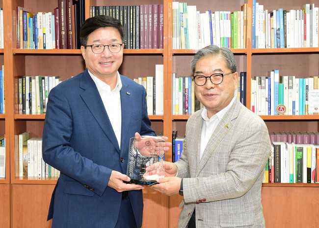 <사진/ 염태영 수원시장(왼쪽)이 5일 오전 경기도교육청 교육감실에서 이재정 교육감으로부터 감사패를 전달받고 기념촬영을 하고 있다.>