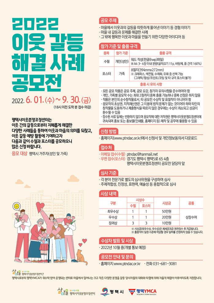 시에서는 2020년부터 이웃분쟁조정센터를 운영하고 있으며, 공모전에 관한 질의 또는 이웃 간의 분쟁으로 상담이나 교육을 희망하는 시민은 평택시 이웃분쟁조정센터(031-681-3081)로 문의가 가능하다.