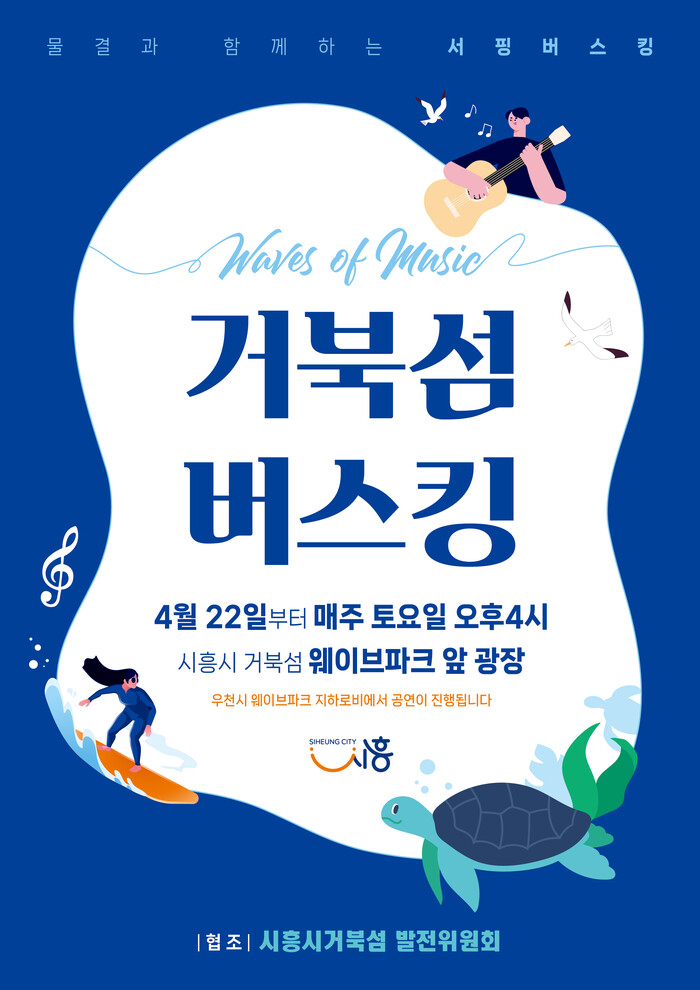 시흥시(시장 임병택)가 거북섬 상권 활성화를 위해 시민 및 관광객의 토요일 감성을 가득 채워줄 버스킹(거리공연)을 진행한다. 오는 4월 22일을 시작으로 6월 24일까지 10주간 매주 토요일 오후 4시에 거북섬(MTV) 웨이브파크 앞 광장에서 물결과 함께하는 ‘거북섬 버스킹 Waves Of Music’을 선보인다.