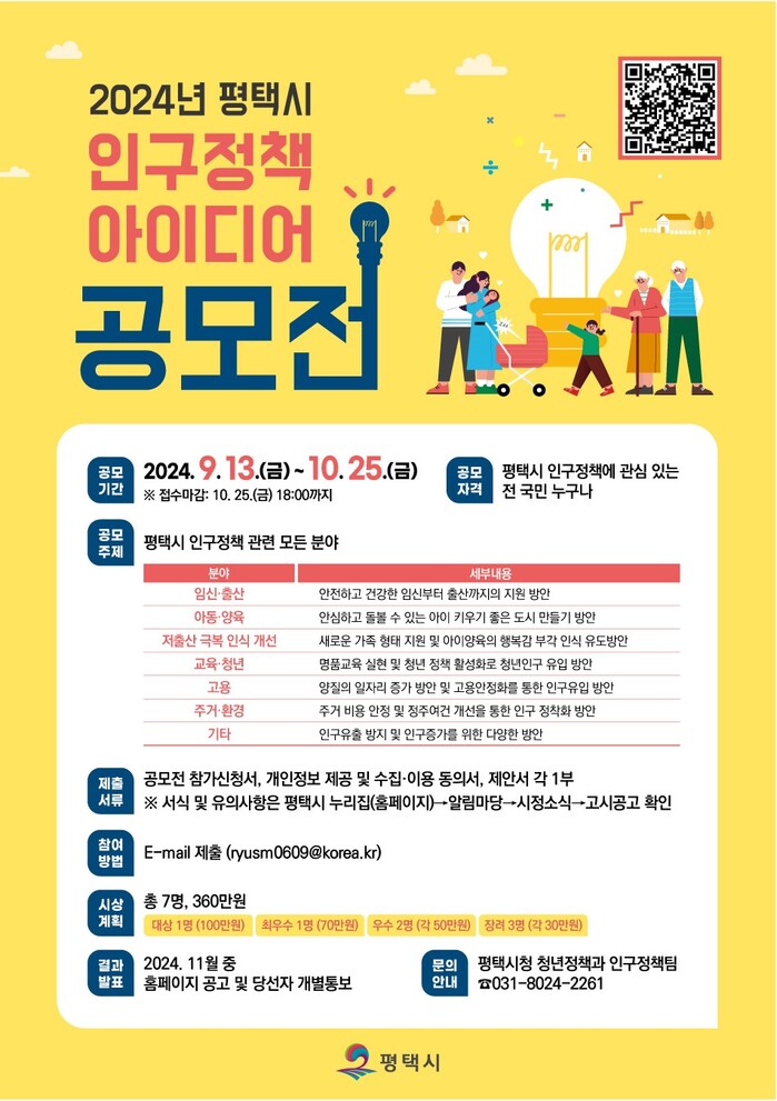 평택시(시장 정장선)는 ‘2024년 평택시 인구정책 아이디어 공모전’을 오는 10월 25일까지 개최한다.