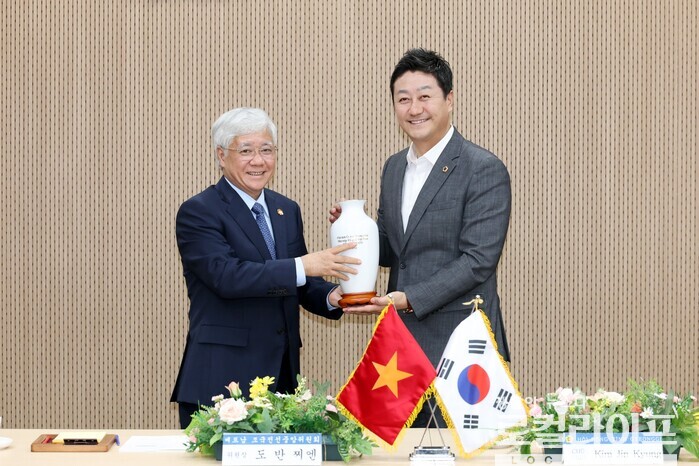 | ▲ 김진경 경기도의회 의장(오른쪽)과 도 반 찌엔 베트남 조국전선중앙위원장(왼쪽)과 기념선물을 교환하고 있다. (사진출처=김진경 페이스북) |