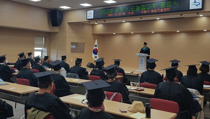 수원시농업기술센터는 20일 권선구 농업기술센터 대강당에서 ‘2022년도 수원시 시민농업대학 졸업식’을 열고, 졸업생 38명을 배출했다.