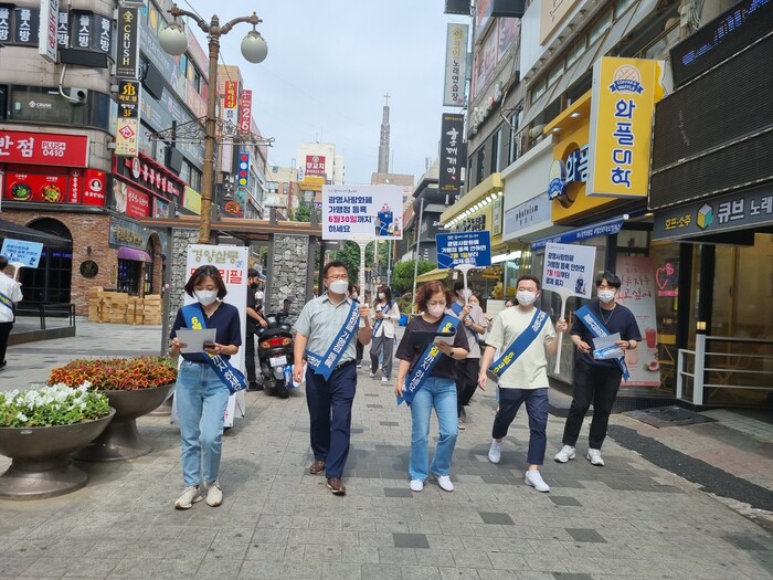 광명시(시장 박승원)는 17일 철산 상업지구에서 자영업지원센터, 골목상권 청년지원단, 지역화폐마케터 등 20여 명과 함께 광명사랑화폐 가맹점 등록을 위한 홍보 캠페인을 실시했다.