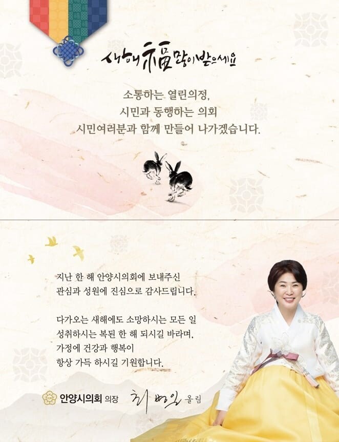 그러면서 앞으로도 저와 우리 안양시의회는 다가오는 2023년에 시민 여러분의 대의기관으로서 시민들의 행복만을 생각하며 최선을 다하도록 하겠다고 강조했다.