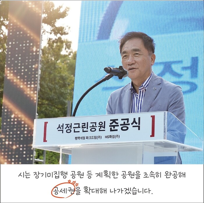 그러면서 평택시와 화성산업이 만든 석정근린공원은 6만5000평 규모로 북부를 대표하는 공원이 될 것이라며, 공원에는 울창한 숲속 산책로를 따라 다양한 시설이 마련됐다고 강조했다.