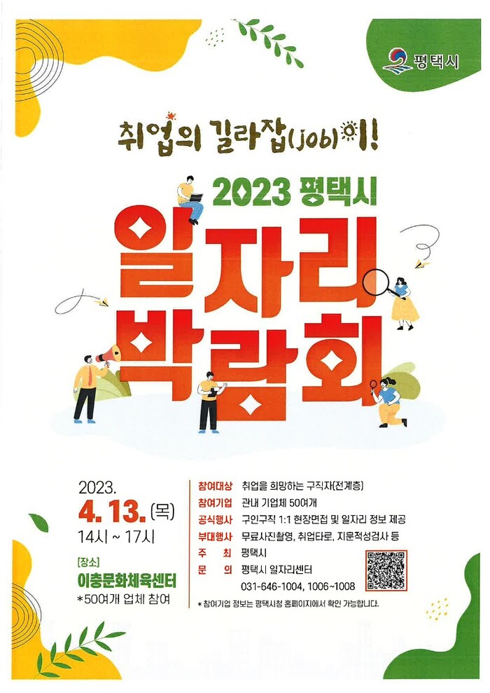 평택시(시장 정장선)는 오는 13일(목) 오후 2시부터 5시까지 이충문화체육센터에서 관내 우수기업의 구인난 해소 및 구직자의 취업 기회 확대를 위한 「2023 평택시 일자리박람회(취업의 길라잡(JOB)이!)」를 개최한다고 밝혔다.