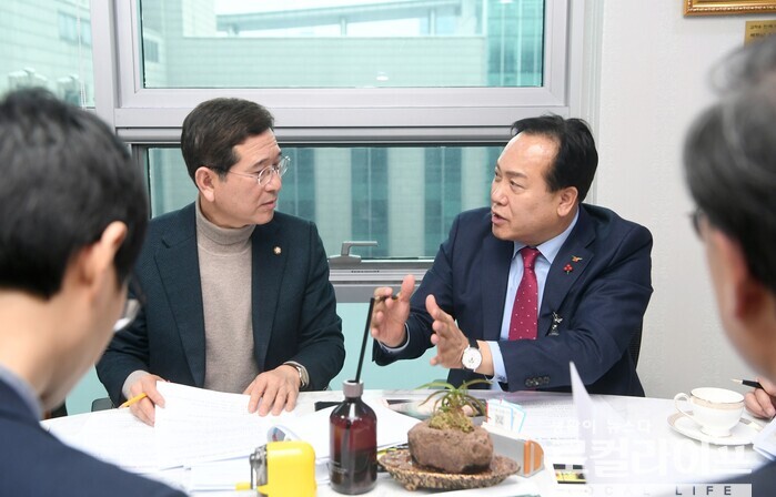 | ▲ 자료사진. 이권재 오산시장(오른쪽)이 지난 2022년 당시 김학용 국회의원을 만나 '운암뜰 AI시티 도시개발사업'을 위한 법 개정 필요성을 설명하고 있다. (사진출처=이권재 페이스북) |
