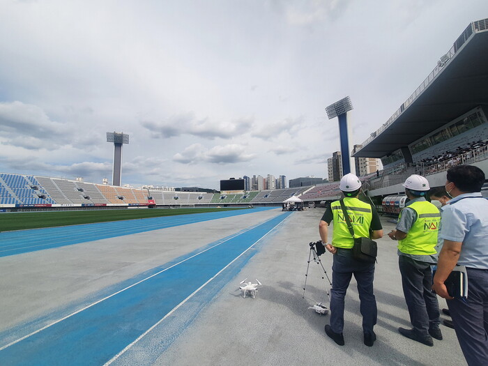 사진/ 수원종합운동장에서 드론을 활용해 시설 안전 점검을 하는 모습(사진제공=수원시)