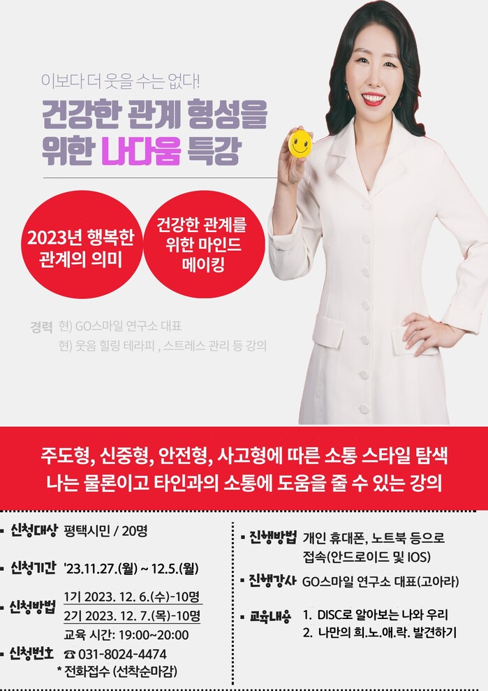 이번 프로그램은 ‘건강한 관계를 위한 마인드 메이킹’-마음의 근육을 위한 나만의 회복탄력성 만들기와 나만의 희.노.애.락 발견하기, ‘DISC로 알아보는 나와 우리’-주도형, 신중형, 안전형, 사교형에 따른 소통 스타일 탐색과 유형별 강점을 활용한 관계의 자신감을 형성하는 시간을 가진다.