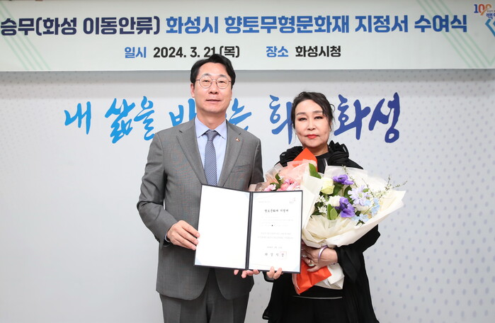 화성시(시장 정명근)가 ‘승무(화성 이동안류)’를 화성시 향토무형문화재 제1호로 지정하고 21일 향토무형문화재 보유자로 선발된 김정아 씨에게 향토문화재 지정서를 교부했다.