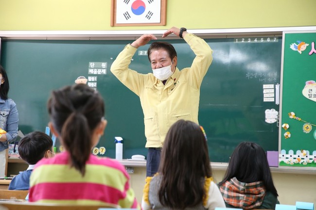 최 시장은 아이들 등교시간에 맞춰 학교를 방문, 전윤조 교장과 함께 열화상체온계로 발열을 측정하고, 교실로 인솔하면서 반갑게 맞이했다.