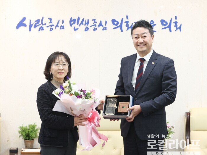 [경기=로컬라이프] 송준형 기자 = 김진경 경기도의회 의장이 조지숙 국회 파견 자문위원에게 감사패를 전달했다.