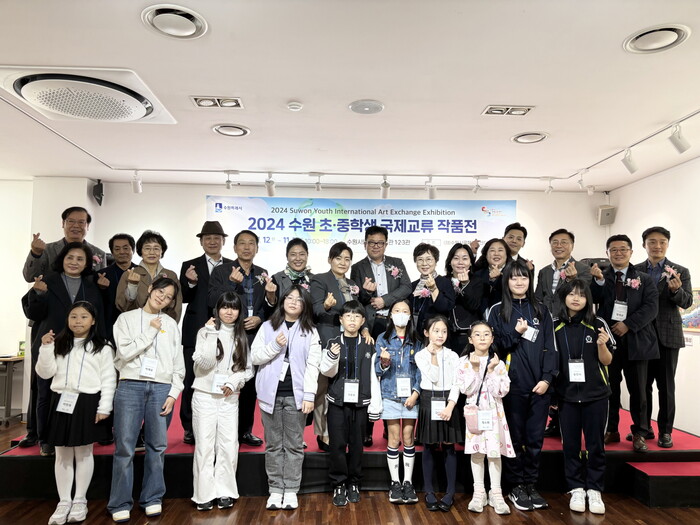 사진/‘2024 수원 초·중학생 국제교류 작품전’ 개막식에서 김현수 수원시 제1부시장과 참석자들이 함께하고 있다.(사진제공=수원시)