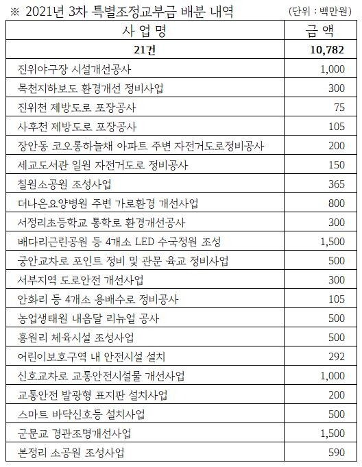 이번에 확보한 특별조정교부금은 진위야구장 시설개선 공사 10억원 등 총 21건의 주요현안 사업에 쓰일 예정이다.