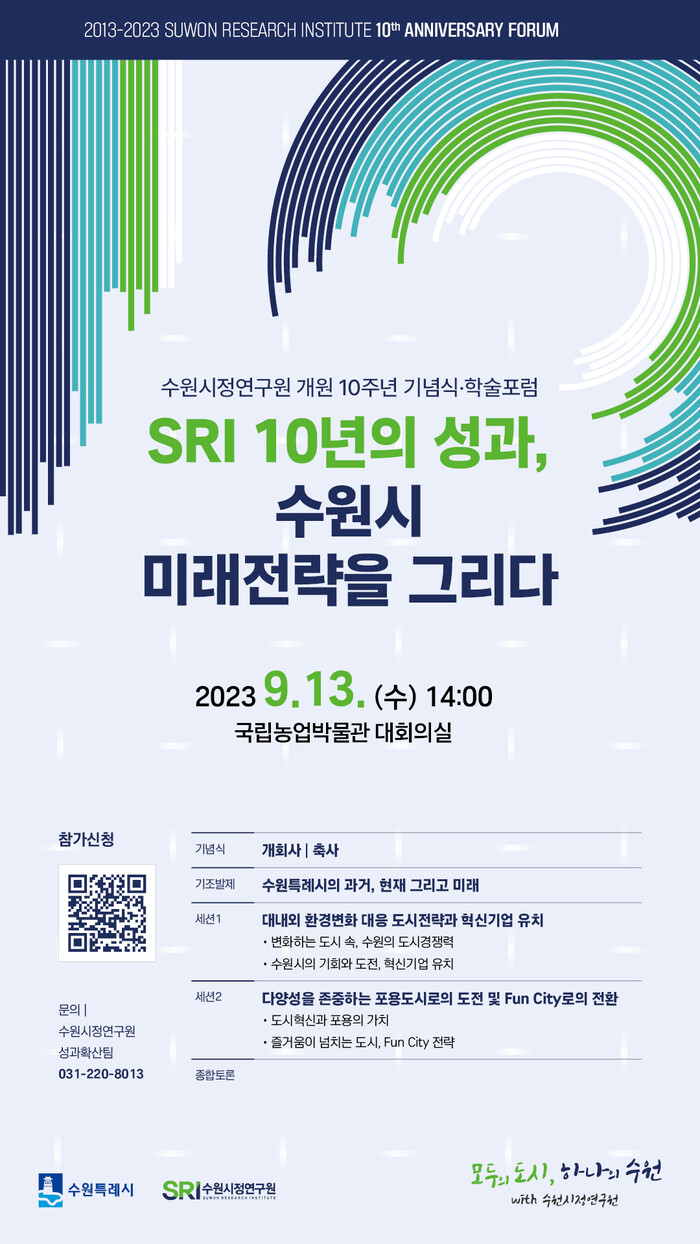2부 ''SRI 10년의 성과, 수원시 미래전략을 그리다''라는 주제의 학술포럼은 이재준 수원특례시장이 '수원특례시의 과거, 현재 그리고 미래'라는 주제로 기조발제를 한다. 이어서 '변화하는 여건 속 수원의 도시경쟁력 강화 전략'(김현수 단국대 교수), '수원의 기회와 도전, 혁신기업 유치'(양은순 수원시정연구원 연구위원), '도시혁신과 포용의 가치, 어떻게 모두를 배려한 도시를 만들것인가'(황희연 충북대 명예교수), '즐거움이 넘치는 도시, Fun City 전략'(강식 경기연구원 선임연구위원)을 각각 주제발표한다.