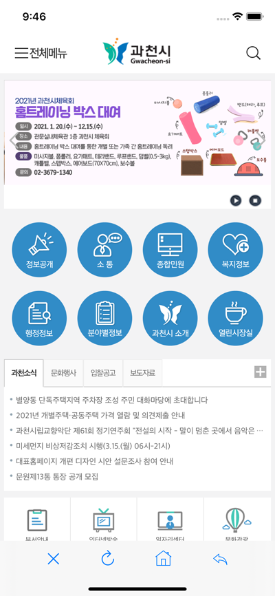 이에 사용자들의 불편함을 해소하고자 과천마당 앱 화면 하단에 메뉴바를 신설하고 새로고침, 멈춤, 홈, 뒤로가기 기능을 사용할 수 있게 수정하였다.