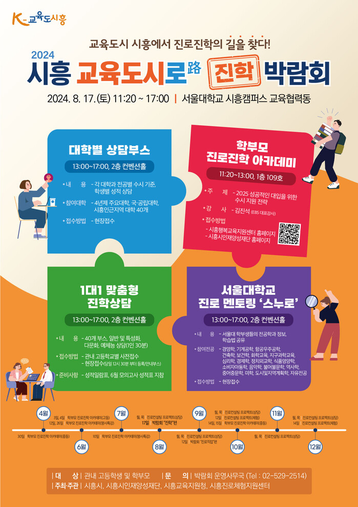 시흥시(시장 임병택)는 시흥진로체험지원센터, 시흥시인재양성재단, 시흥교육지원청과 공동 주최로 8월 17일 11시 20분부터 17시까지 서울대학교 시흥캠퍼스 교육협력동에서 ‘2024년 시흥 교육도시로(路) 진학 박람회’를 개최한다.