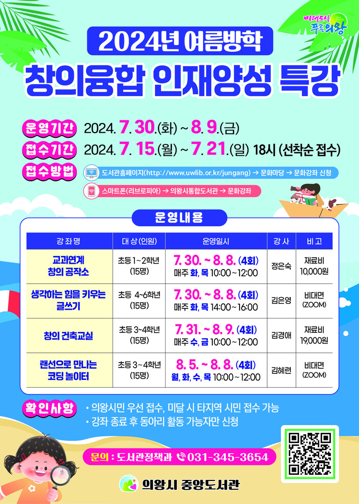 의왕시 중앙도서관은 여름방학을 맞아 초등학생을 위한 다양한 창의융합 인재양성 특강을 운영한다.