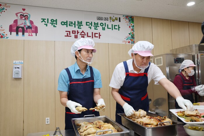 아울러 점심시간에는 하은호 시장이 안동광 부시장과 함께 구내식당에서 직원들을 위한 배식에 참여하여 직원들에게 고마운 마음을 직접 표현함으로써 구내식당을 찾은 직원들을 깜짝 놀라게 했다.