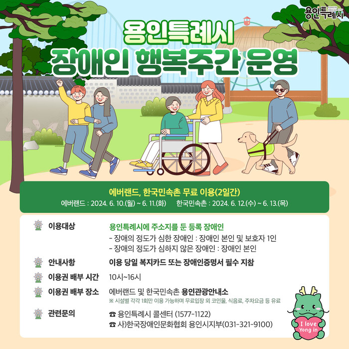 시는 (사)한국장애인문화협회 용인시지부와 후원처인 에버랜드, 한국민속촌의 사회기여 협의를 통해 지역 내 장애인의 문화와 여가생활을 지원한다. 행복주간 기간 용인특례시에 등록된 장애인은 에버랜드와 민속촌을 무료로 입장할 수 있다.