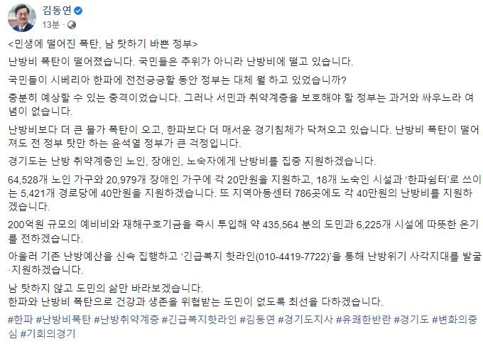 김동연 경기도지사는 26일 자신의 사회관계망서비스(SNS)를 통해 “민생에 떨어진 폭탄, 남 탓하기 바쁜 정부다. 국민들이 시베리아 한파에 전전긍긍할 동안 정부는 대체 뭘 하고 있었는가”라며 “남 탓하지 않고 도민의 삶만 바라보겠다. 한파와 난방비 폭탄으로 건강과 생존을 위협받는 도민이 없도록 최선을 다하겠다”고 말했다.