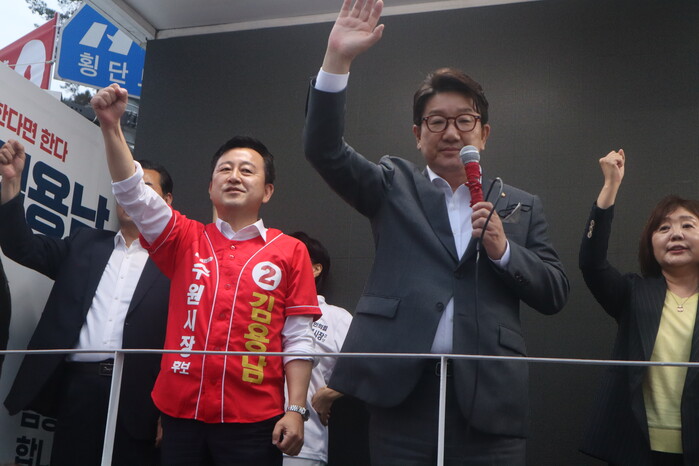 권 원내대표는 “김용남 후보가 수원시장이 되면 제가 대통령과 함께 수원의 숙원 사업들을 해결할 수 있도록 힘쓰고, 집권 여당의 원내대표로서 책임지고 수원에 예산 폭탄을 투하하겠다”고 약속했다.