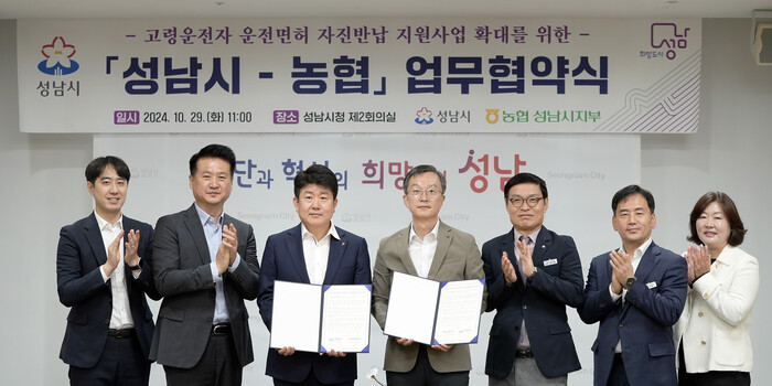 성남시와 농협은29일 오전11시 시청 제2회의실에서 성남시 고령운전자 운전면허 자진반납 확대지원을 위한‘성남시-농협’업무협약식을 개최하고65세 이상 운전면허를 반납한 운전자가 가입하는1년 이내정기예금 상품에0.2%우대금리 지원사업을 제공하기로 합의했다.