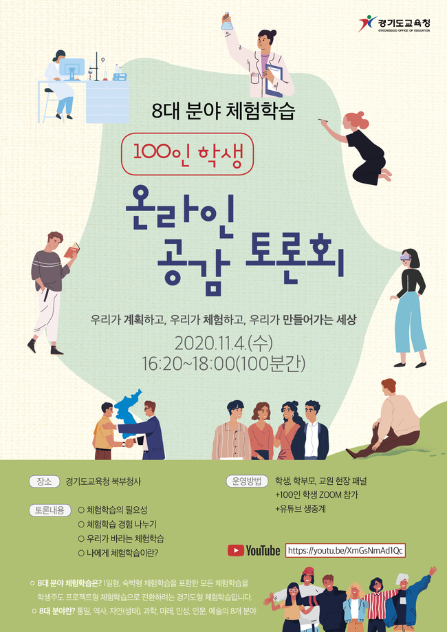 [로컬라이프] 경기도교육청(교육감 이재정)이 4일 학생들과 함께 코로나19 상황에서도 참여 가능한 새로운 체험학습 방법을 찾기 위한 ‘8대 분야 체험학습 100인 학생 온라인 공감 토론회’를 연다.