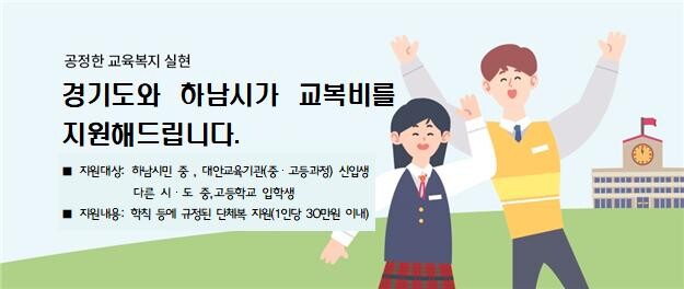 관외 중·고등학생 및 대안교육기관 신입생의 경우 신청서·재학증명서·교복구매영수증 등을 준비해 거주지 동 행정복지센터에서 신청하거나 경기민원24(gg24.gg.go.kr)를 통해 신청하면 된다.