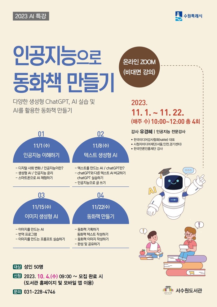 서수원도서관이 인공지능 특강 ‘AI로 동화책 만들기’에 참가할 시민 50명을 10월 4일 오전 9시부터 모집한다.