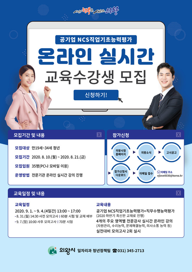 [로컬라이프] 의왕시(시장 김상돈)는 지난 6월 공기업 NCS직업기초능력평가를 위한 ‘NCS집중캠프’를 집합교육으로 실시한데 이어, 오는 9월에는 온라인 실시간 강의로 프로그램을 진행한다고 밝혔다.
