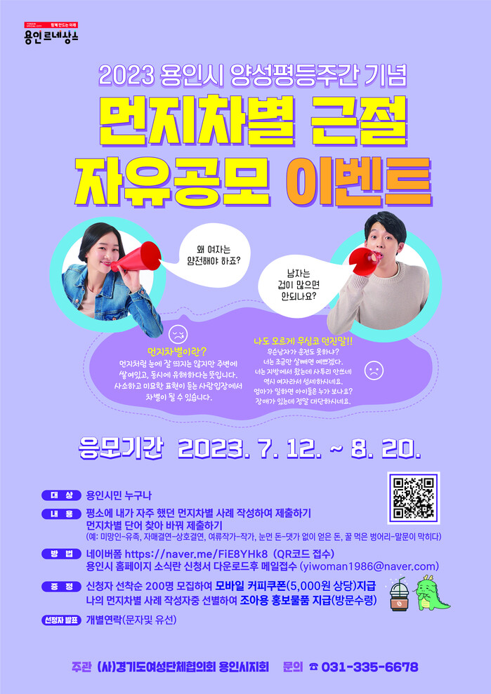 참여 방법은 자신이 겪었던 차별 사례나 단어를 이메일(yiwoman1986@naver.com)로 접수하거나 포스터 QR코드를 통해 발송하면 된다. 이메일로 접수할 경우, 용인특례시 홈페이지(https://www.yongin.go.kr)에서 양식을 내려받아 응모하면 된다.