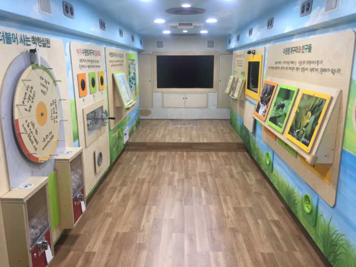 환경 콘텐츠 체험은 생태체험이 가능하도록 대형버스를 교육 시설로 개조한 이동형 환경교실 버스에서 진행한다.