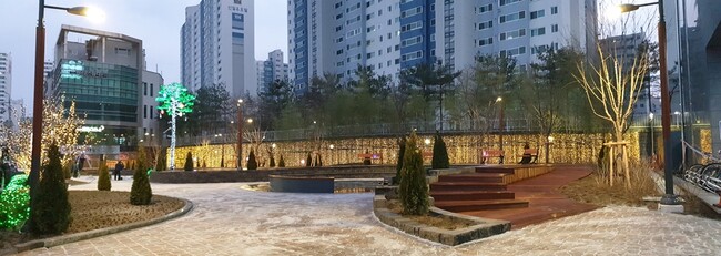 공원 주변의 유동인구를 고려하여 시민들이 언제든지 편리하게 공원을 이용할 수 있는 개방감을 극대화하고자 공원 전면부에 ‘오픈스페이스 공간’을 조성했으며, 편안하고 안락하게 사색하며 힐링할 수 있는 ‘정원 공간’을 조성했다. 또한, 야간에 주로 운영하는 주변 상가를 고려하여 공원의 야간 경관과 안정성을 향상할 수 있는 광섬유조명이 설치되어 그동안 어둡고 낙후된 도시 환경이 밝고 세련된 공간으로 바꿨다.