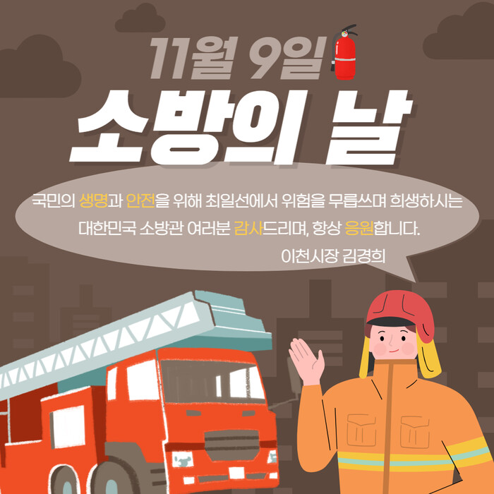 이와 관련해 김경희 이천시장은 9일, 자신의 페이스북을 통해 밤낮없이 항상 최일선에서 위험을 무릅쓰며 국민의 생명과 안전을 위해 헌신하는 소방관, 의용소방대원 여러분 진심으로 감사하다고 전했다.