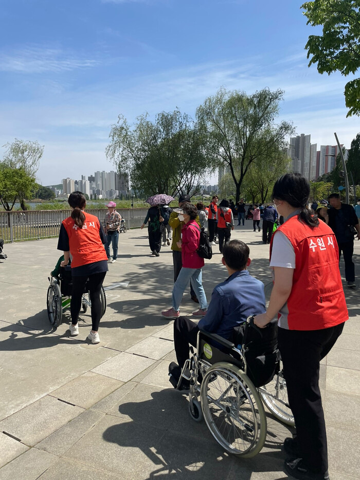장애인의 날(4월 20일)을 맞아 22일 광교호수공원에서 자원봉사자와 장애인이 함께 호수 둘레를 산책하는 ‘다~함께 돌자 호수 한 바퀴’ 행사가 열렸다.