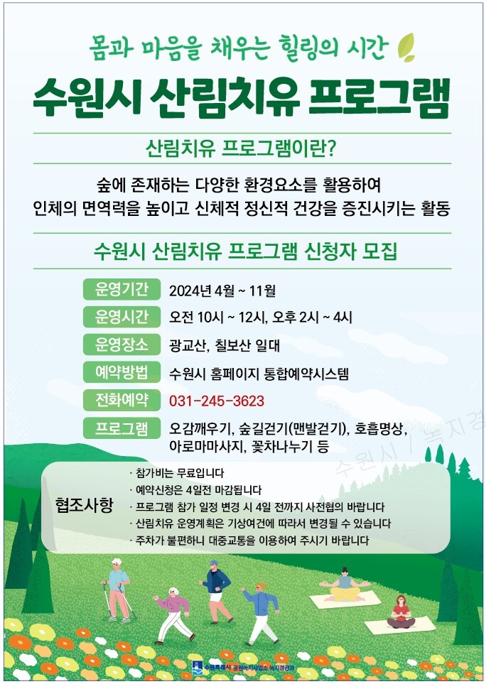 수원시(시장 이재준)가 광교산, 칠보산, 수원수목원 등에서 2024년 산림치유 프로그램을 운영한다.