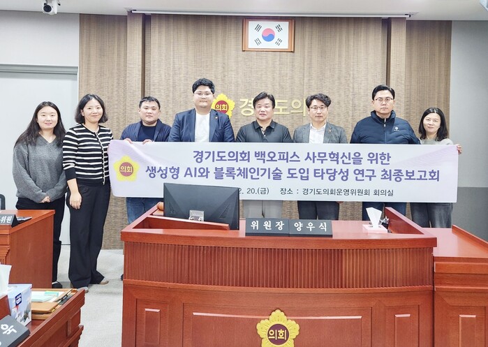 경기도의회 혁신추진특별위원회는 20일 의회운영위원회 회의실에서 ‘경기도의회 백오피스 사무혁신을 위한 생성형 AI와 블록체인기술 도입 타당성 연구’에 대한 정책연구용역 최종보고회를 개최했다.