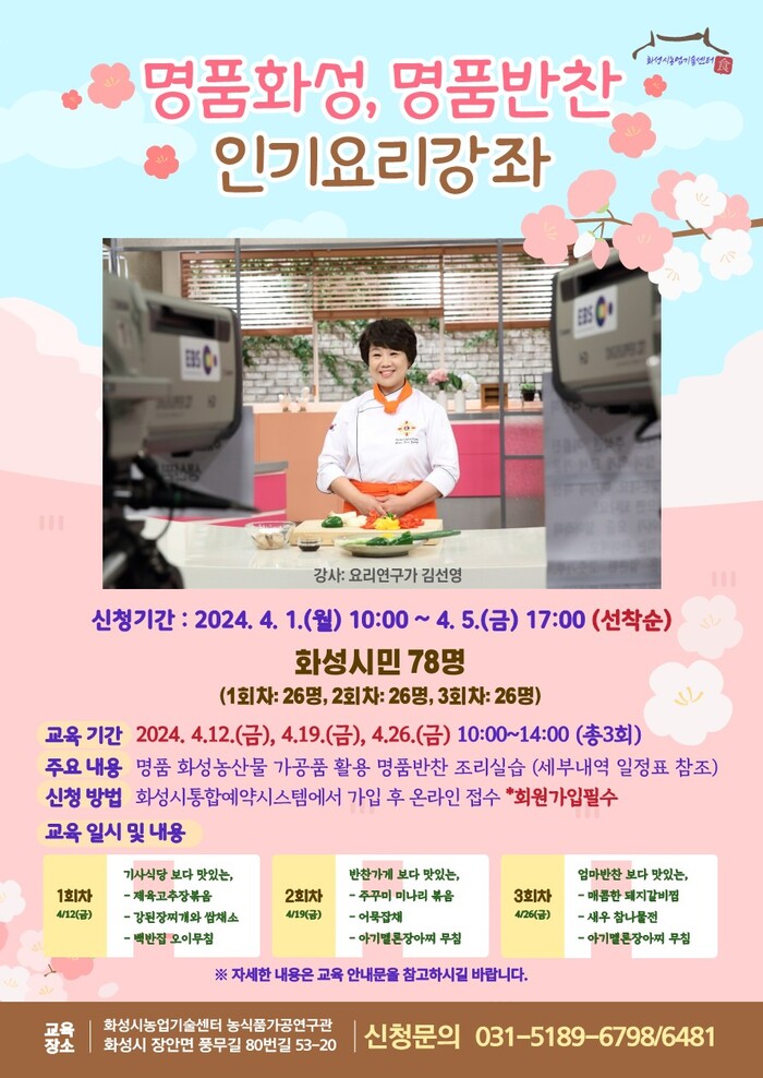 화성시(시장 정명근)가 화성시농업기술센터에서 요리연구가 김선영과 함께하는 ‘명품화성, 명품반찬 인기요리 강좌’프로그램을 운영한다.
