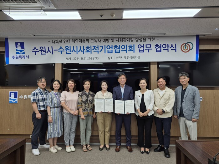 수원시와 수원시사회적기업협의회는 11일 시청 영상회의실에서 ‘사회적 연대 취약계층의 고립 예방을 위한 사회관계망 사업 업무협약’을 체결했다. 이날 협약식에는 수원시 관계자, 이행순 수원시사회적기업협의회장 등이 참석했다.