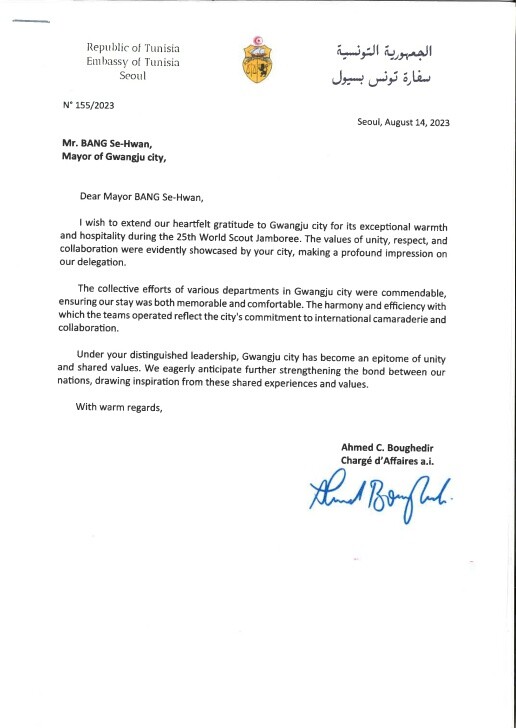 2023 새만금 세계 스카우트 잼버리에서 조기 퇴영해 광주시에 체류한 잼버리 참가국 대사관이 광주시에 서신을 보내 자국 대원들 지원에 감사를 표했다.