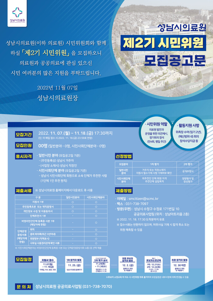 [로컬라이프] 성남시의료원(대표이사 안태영)은 제2기 시민위원회 출범을 위해 시민위원을 모집한다고 밝혔다.
