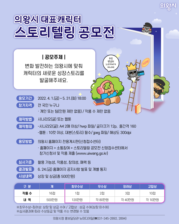 스토리텔링 공모전과 관련한 자세한 사항은 의왕시청 홈페이지 공지사항에서 확인하거나, 홍보담당관 뉴미디어팀(☎031-345-2892)로 문의하면 안내받을 수 있다.