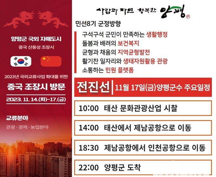 [양평=로컬라이프] 송준형 기자 = 자매도시인 중국 조장시 방문 마지막날 전진선 양평군수는 태산 문화관광산업을 시찰했다.