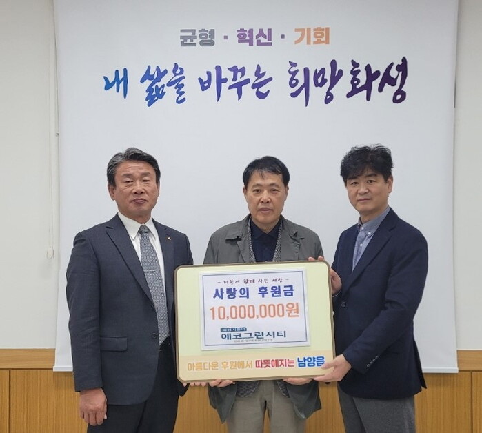 화성시청역 에코그린시티가 19일 화성시 남양읍행정복지센터에 따뜻하고 더불어 사는 아름다운 실천을 위한 후원금 1천만 원을 전달했다.