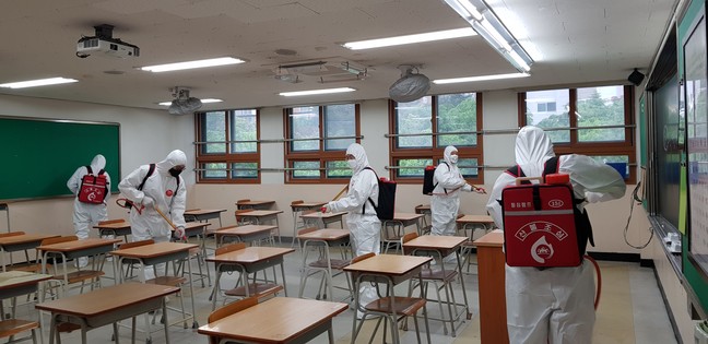 <사진/ 관내 한 고등학교를 방역소독 하고 있는 모습>