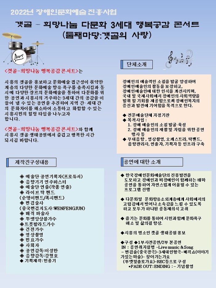 시흥 명소인 갯골을 널리 홍보하고자 갯골에서 열린 이번 콘서트는 공연문화를 접하기 어려운 다문화 가족의 3세대가 문화예술 공연을 함께 관람할 수 있도록 한국장애인문화예술단에서 기획했다.